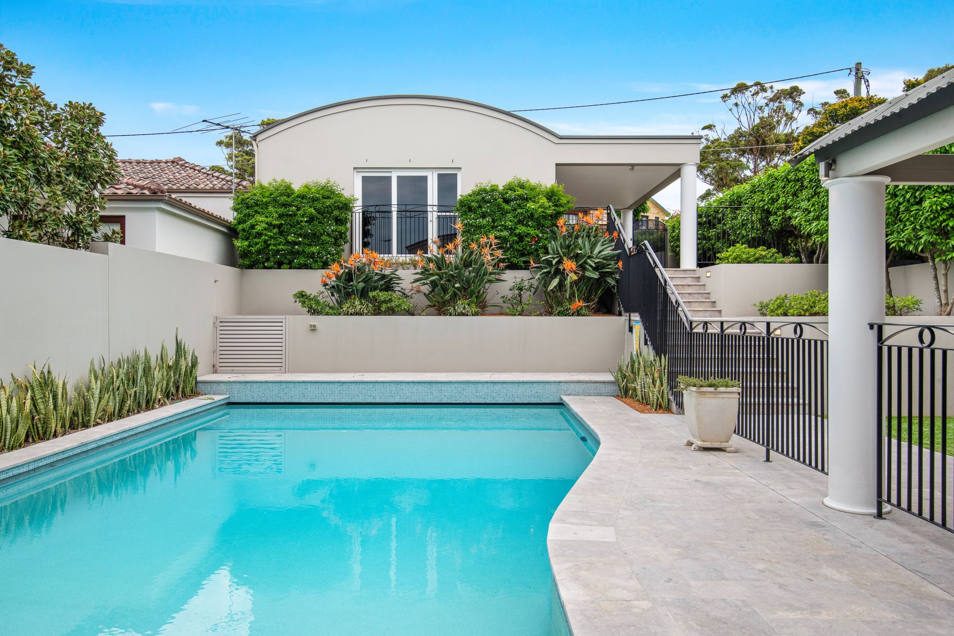 - Heated salt water pool (with electric cover) framed by lush sculpted gardens